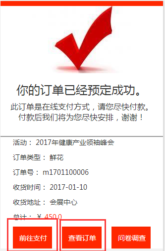 5、进入预订成功页面,同时系统会发送手机短信和邮箱信息,单击支付,前往支付,单击查看,查看订单详情。如下图