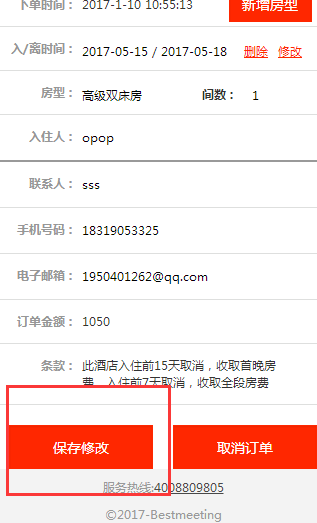 5.进入订单详情页面,修改基本信息后单击保存修改,注意只有房型才有保存修改。如下图